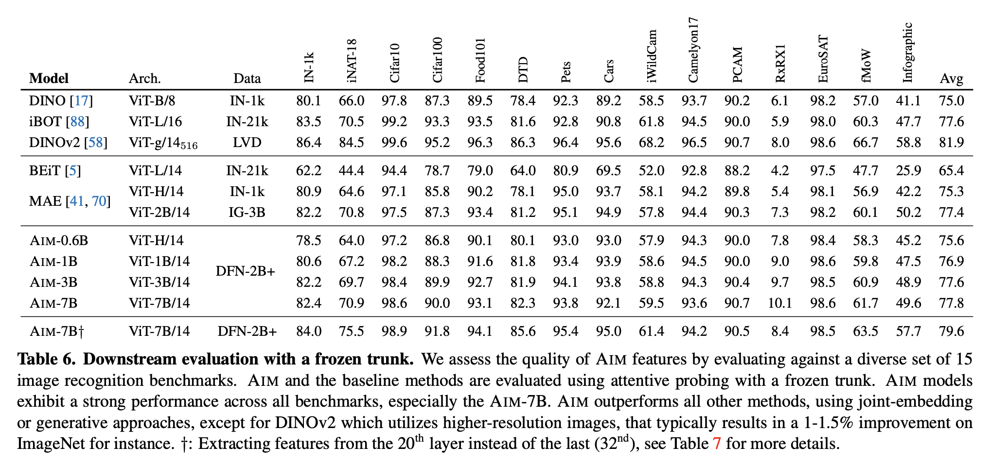 ๋ค๋ฅธ pretrained ๋ชจ๋ธ๋ค๊ณผ์ ๋น๊ต์ด๋ค. DINOv2๋ฅผ ์ ์ธํ๊ณ AIM์ด ๋ชจ๋ ์ด๊ฒผ๋๋ฐ, DINOv2๋ ๋ ๋์ ํด์๋ ์ด๋ฏธ์ง๋ฅผ ์ด์ฉํ๋ค๊ณ ํ๋ค. ๊ทธ๋ฆฌ๊ณ DINOv2๋ ์ฌ๋ฌ๊ฐ์ง ์์ง๊ตฌ๋ ํ ํ์ต ํธ๋ฆญ๋ค์ ํฌ๊ฒ ์์กดํ๊ณ ์๋๋ฐ, AIM์ ํ์ต ๋ฐฉ๋ฒ์ด ๋งค์ฐ ๊ฐ๋จํ๋ค๊ณ ํ๋ค (...)