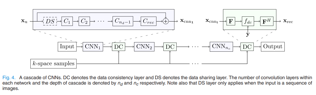 - CascadeNet의 구조이다. CNN Block과 DC(Data Consistency) Block이 번갈아 가며 reconstruction이 진행된다.