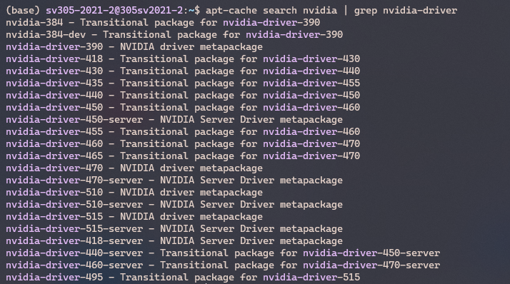 apt-cache search nvidia | grep nvidia-driver #์ค์น ๊ฐ๋ฅ ๋๋ผ์ด๋ฒ ๋ชฉ๋ก ํ์ธ