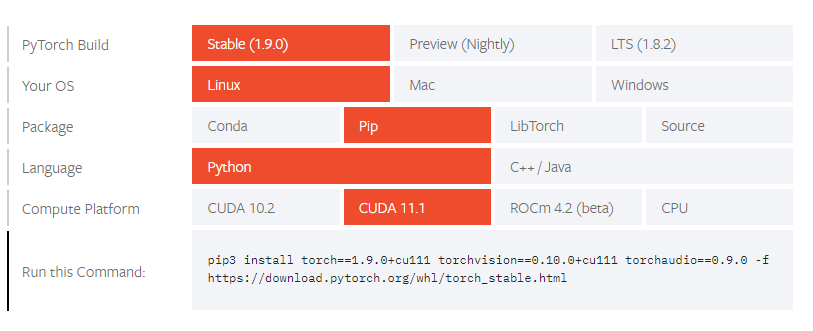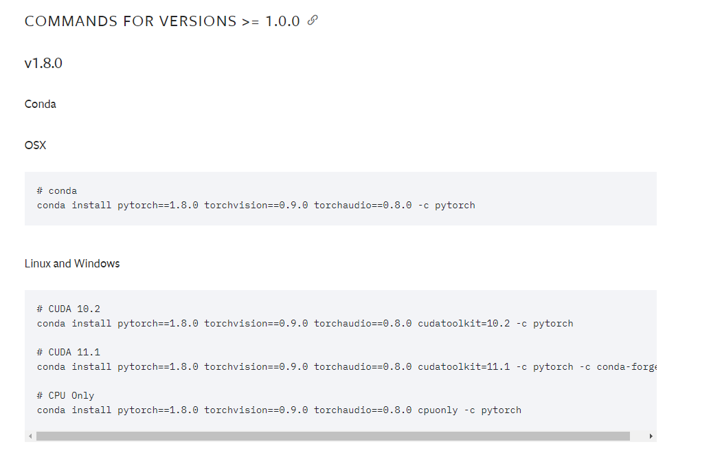 ์ต์ version์ฒ๋ผ ์น์ ํ๊ฒ ์๋ ค์ฃผ์ง๋ ์์ง๋ง, ๋ง์ฐฌ๊ฐ์ง๋ก PyTorch version, ํ์ฌ ์ด์์ฒด์ , ๋ค์ด๋ก๋ํ ๋ฐฉ๋ฒ, ์ฌ์ฉํ ์ธ์ด, CUDA version์ ๋ฐ๋ผ ๋ช ๋ น์ด๊ฐ ์ ๋ฆฌ๋์ด ์๋ค.